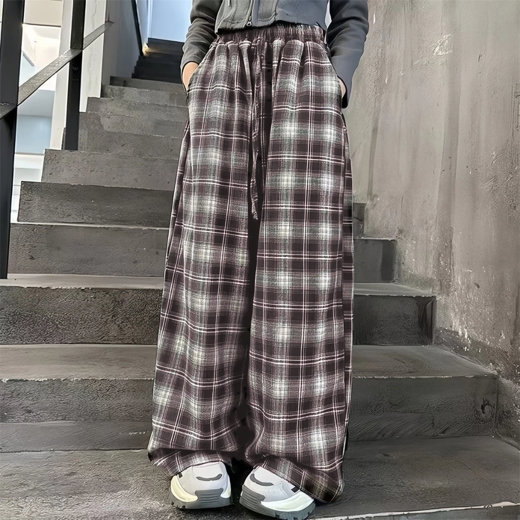 กางเกงลายสก็อตสไตล์เกาหลี กางเกงลำลอง ทรงหลวมใส่สบาย กางเกงขากว้างสำหรับเด็กผู้หญิง