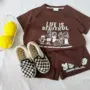 เสื้อยืดแขนสั้นพิมพ์ลายน่ารักกางเกงขาสั้น สีน้ำตาล